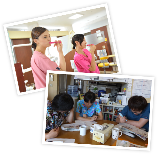 新しく入るスタッフさんに対しては、積極的に浅香歯科の雰囲気に慣れる環境を作っていきます!仕事においては、みんな対等なので、お互いに相談しながら一緒に学んでいくという風通しの良い医院ですね。仕事の充実においても、目標を立てアドバイスをしながら、少しずつできる事を増やして実践し、日々の充実感、達成感につなげていきます!